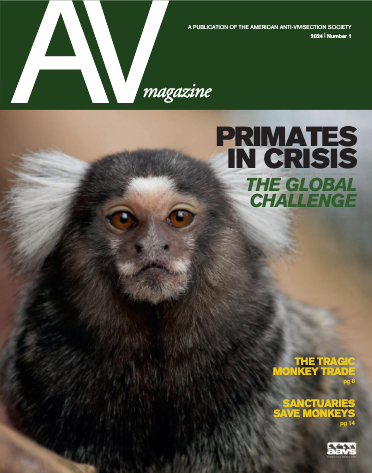 A-V is a quarterly publication of the American Anti-Vivisection Society. Each issue highlights important topics related to the use of animals in research, testing, and education. Members of AAVS receive the A-V (in print) and the digital version is available here.